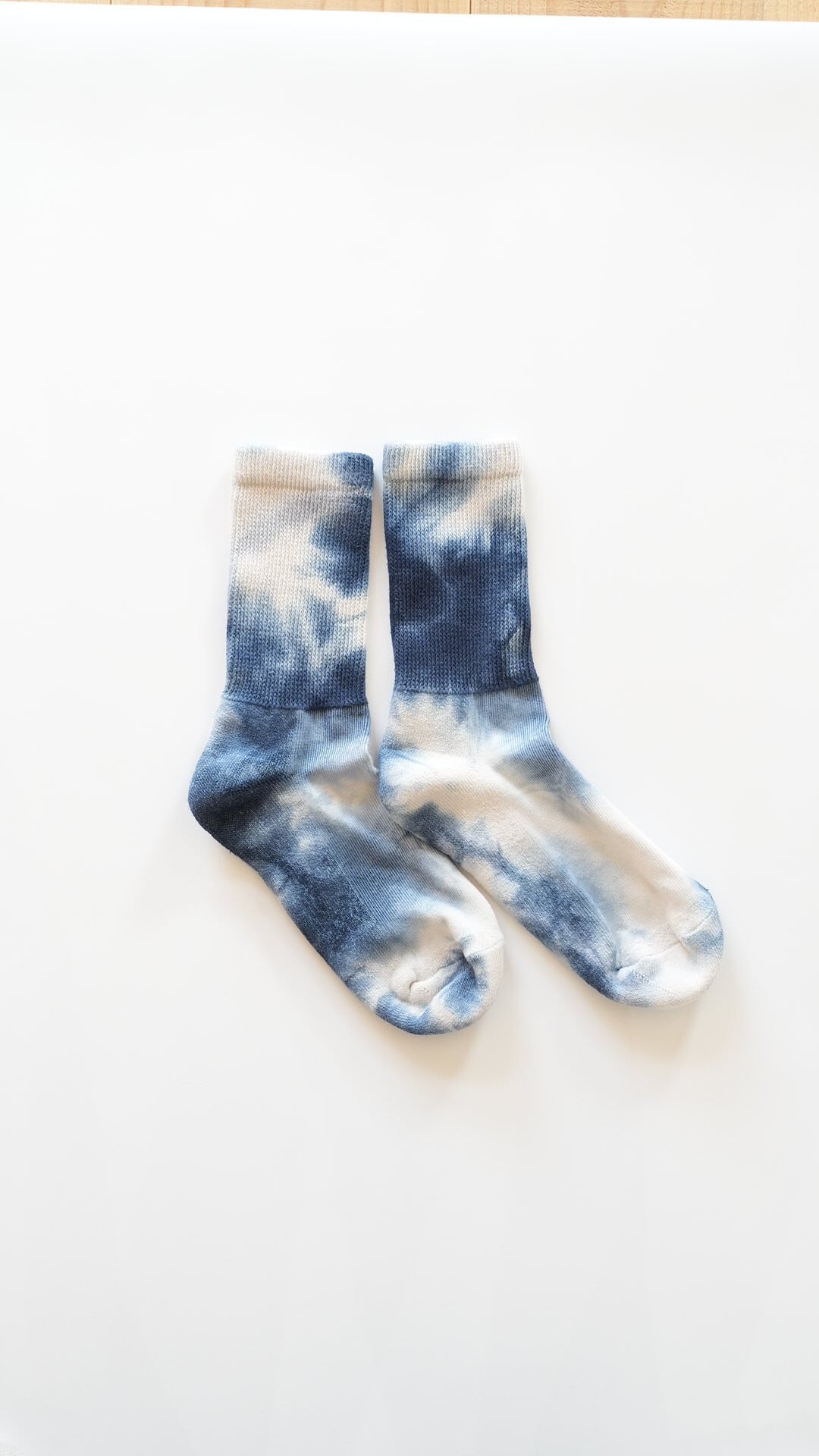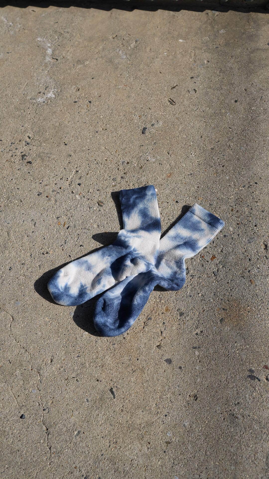 製品を筒に詰め込み染料を流し込んで染める手法で、製品の向きやアタリ方で、染まる割合がかわっていくのが特徴。タイダイよりも規則性がなく、1 足ずつ表情が違うのが魅力です。