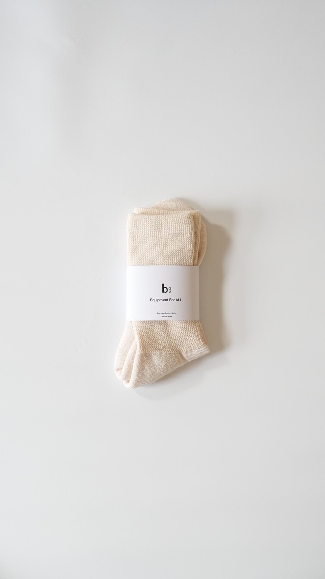 bou_005 Material / コットン・ナイロン・ポリウレタン Size / 23-25cm 25-27cm Color / Ecru・Ecru Gray・Ecru Made in Japan 素材・履き心地にこだわり抜いた、bouを代表するアイテムです。 表糸に100%オーガニックコットンを使っており、通常のコットンよりも柔らかいのが特徴。 履き口部分をガーゼのような特殊な編み方にすることで締め付けを極力なくしています。足底部分もプレーティングという技術で、本来内側に来る補強糸のナイロンを表に出し、肌に触れる裏側に肌触りの良いオーガニックコットンがくるよう設計されています。 補強に使うナイロン糸は、一般的なソックスに使われるポリエステル糸よりも"縮まない"ため、足底の締め付けも少なく、ストレス・負荷を感じさせない構造となっています。 尚且つ足底パイル仕様・足甲部分は薄い天竺編みで、クッション性がありつつもスニーカーや革靴を履いてもごわつかないように計算されています。 欧米の糖尿病患者に向けた医療用のメディカルソックスから着想を得た設計で、足がむくみやすい方にもおすすめです。日本最大の靴下産地奈良県の工場で、一足一足丁寧に編み立てられており、場面を選ばず年間通して履き続けられる1足です。 1Pと2Pがございますので、お間違えの無いようご注意ください。 ※商品写真はできる限り実物の色に近づけるよう徹底しておりますが、お使いのモニター設定、お部屋の照明等により実際の商品と色味が異なる場合がございます。 ※洗濯機で洗う際は、なるべくネットをご使用ください。 ※洗うと多少の縮みが発生する場合がございます。 ※タンブラー乾燥はなるべくお避けください。 ※商品の発送は、ご注文確定後5日以内に発送させていただきます。